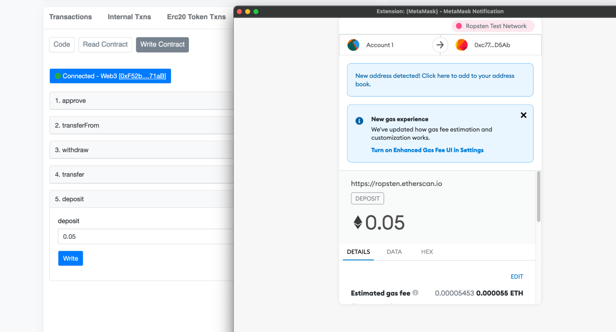 Click “write”. Your MetaMask wallet should appear---approve the transaction and wait for the transaction to get confirmed into the blockchain. Check your MetaMask balances for the new wrapped tokens.
